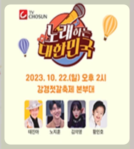 강경젓갈축제에서 빼놓을 수 없는 재미와 즐거움, 인기 가수와 함께하는 화려한 초대가수 라인업이 공개되었습니다. 2023 강경젓갈축제에서는 10. 19.(목) 축제 시작을 알리는 개막 축하공연, 7080 낭만콘서트, KBS 전국노래자랑, TV조선 노래하는 대한민국, 젓갈 명랑운동회를 통해 선선한 바람과 풍경이 아름다운 가을 멋진 초대가수와 함께 강경젓갈축제를 신나게 즐기실 수 있습니다.