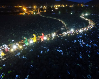 무안 연꽃축제는 낮과 밤이 모두 아름다운 축제입니다. 축제 기간 동안 백련지 달빛 드론 쇼와 백련 불꽃쇼, 문화해설사와 함께하는 연빛 달빛 야행 등 밤 하늘에 불빛이 아름다운 무안 연꽃축제의 야경도 함께 즐겨보세요.