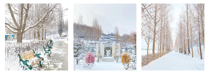 하얗게 내린 눈이 수목원과 하나 되어 아름다움을 더하는 피나클랜드의 겨울 풍경입니다.