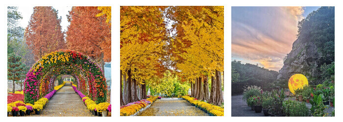 은행나무, 자작나무가 길게 뻗어 있는 수풀 누리와 주차장부터 매표소까지 300m 길이로 늘어선 메타스콰이어 길에 아름답게 물들여진 피나클랜드의 가을입니다.