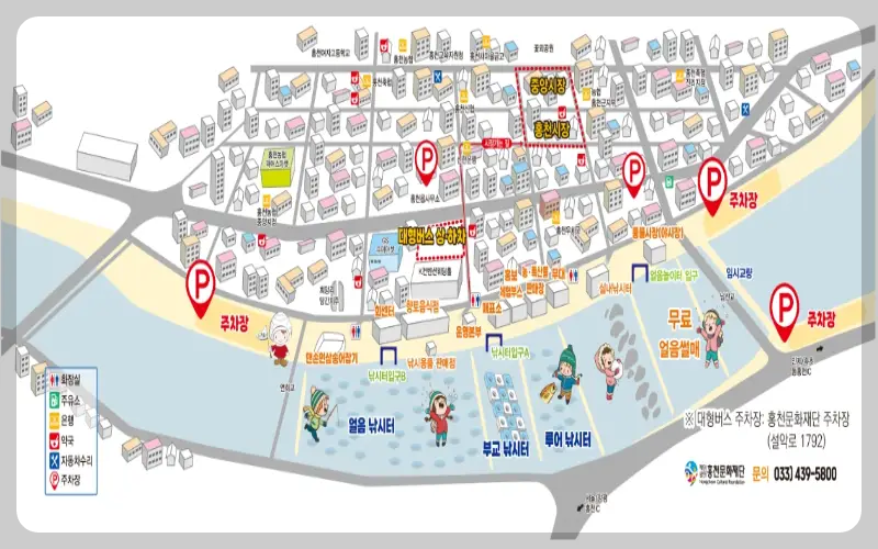※ 홍천강 꽁꽁 축제 행사장 안내도에 낚시터 위치와 체험 부스, 주차장 위치 등을 자세히 확인하실 수 있습니다.